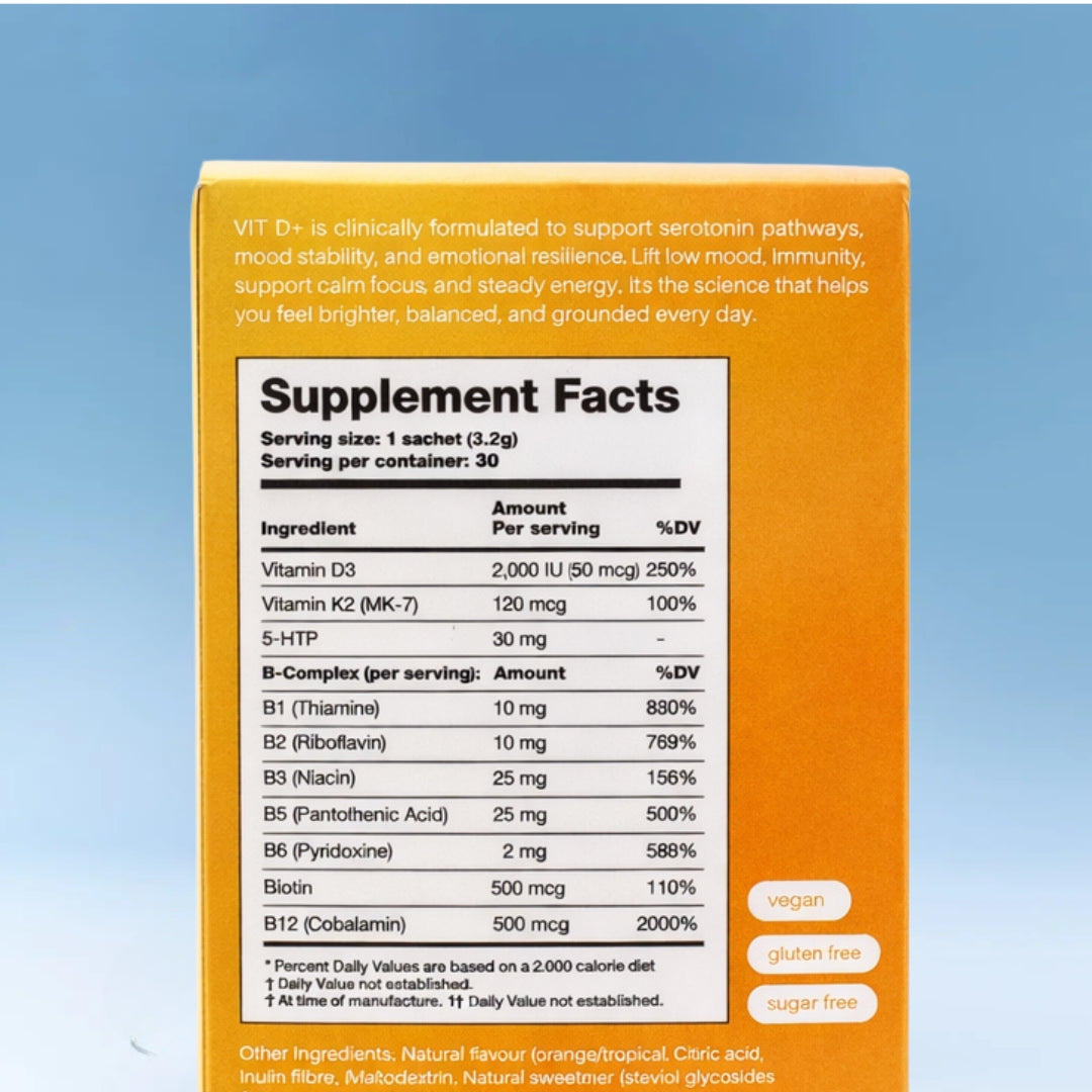 Vit D+ is designed to be taken once daily. Daily use helps maintain optimal vitamin D levels, supporting immune defence, mood stability, bone health, and hormonal signalling.