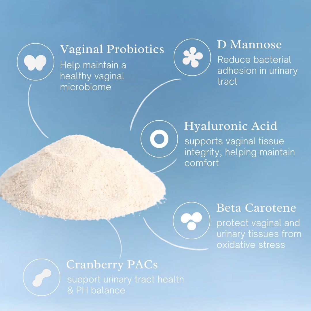 - XOS (prebiotic) feeds beneficial bacteria, strengthening the vaginal ecosystem from within.